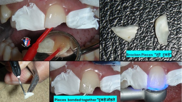 मुँह के आगे के दांत का फ्रैक्चर, लेकिन टूटे हुए टुकड़े मिल गए हैं।